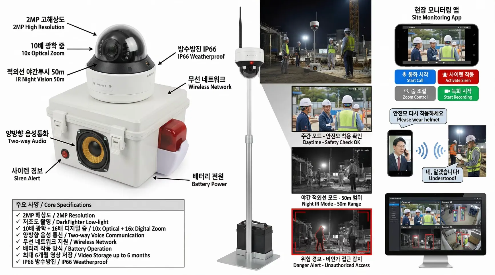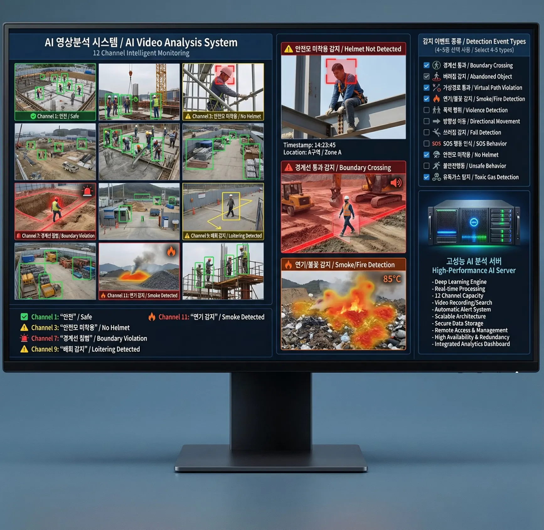 AI 영상분석으로 불안전행동 실시간 감지, 위험구역 자동 경보, 24시간 무인 감시 | |