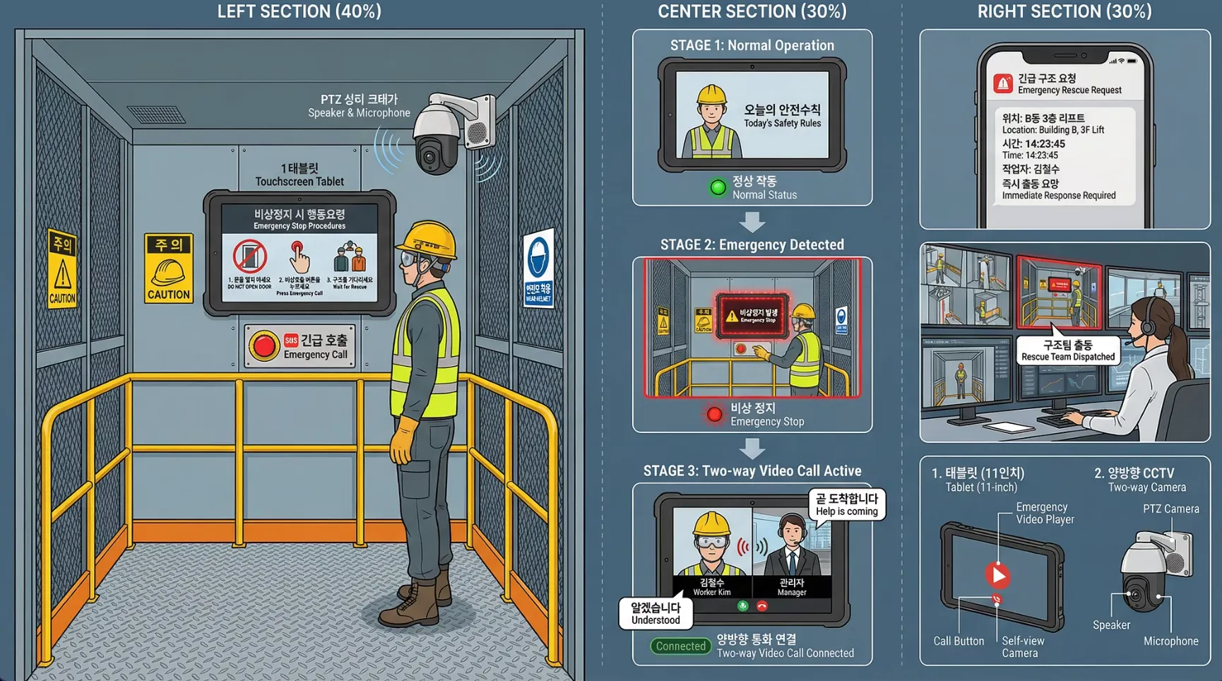 긴급호출 태블릿 | 리프트 내부 설치, 비상정지 시 행동요령 영상 자동 재생, 긴급호출 버튼 → 구조 SMS 발송 |